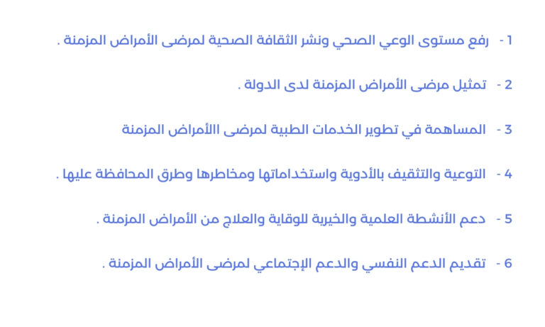 1- رفع مستوى الوعي الصحي ونشر الثقافة الصحية لمرضى الأمراض المزمنة .